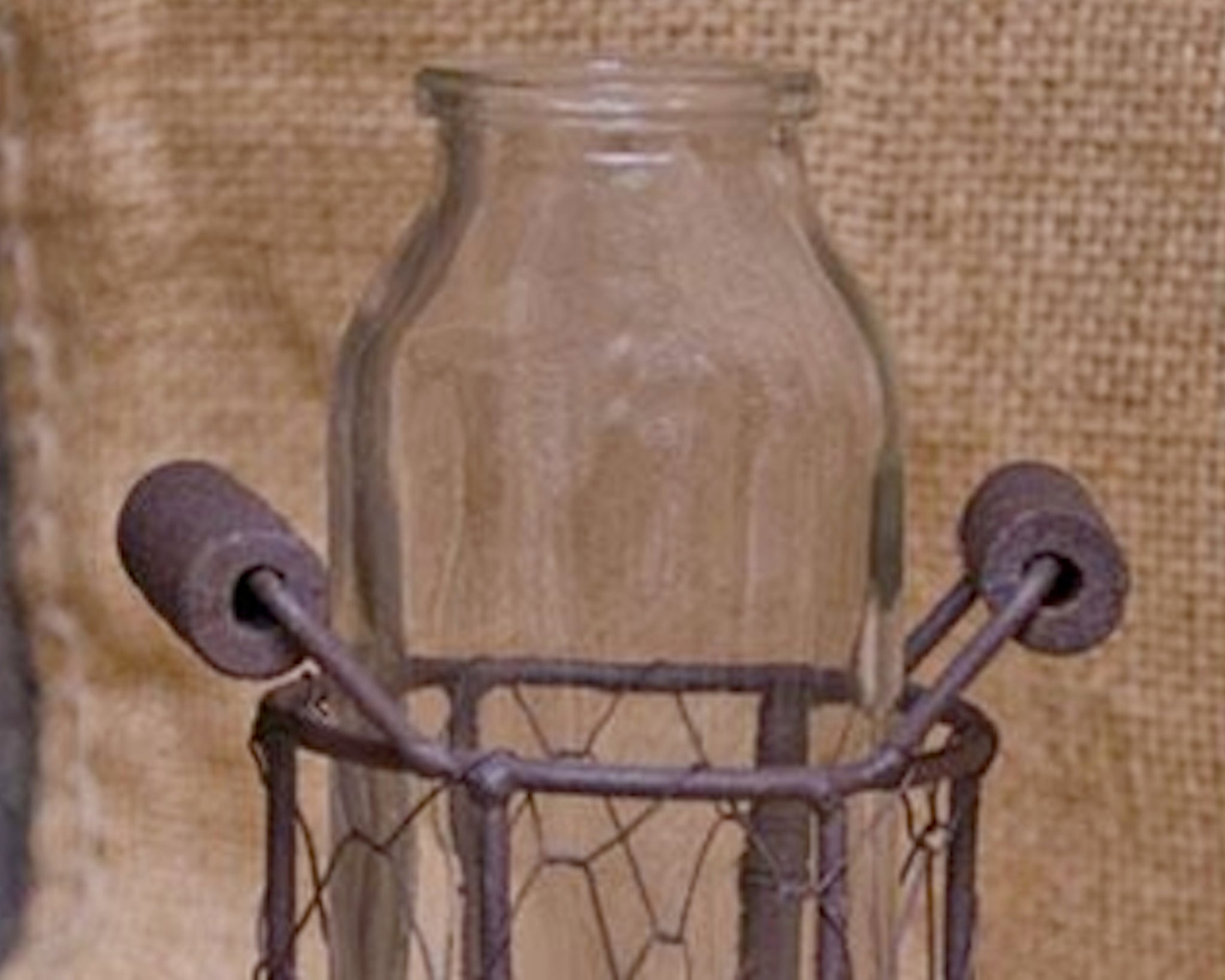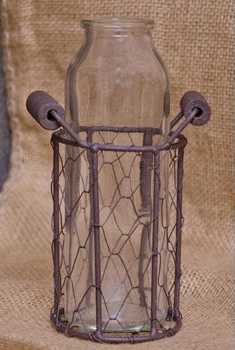 Add rustic charm to a kitchen table with this adorable vase. It features a glass bottle in a rustic wire basket with chicken wire mesh sides and two small handles. It's a great size for small flowers.