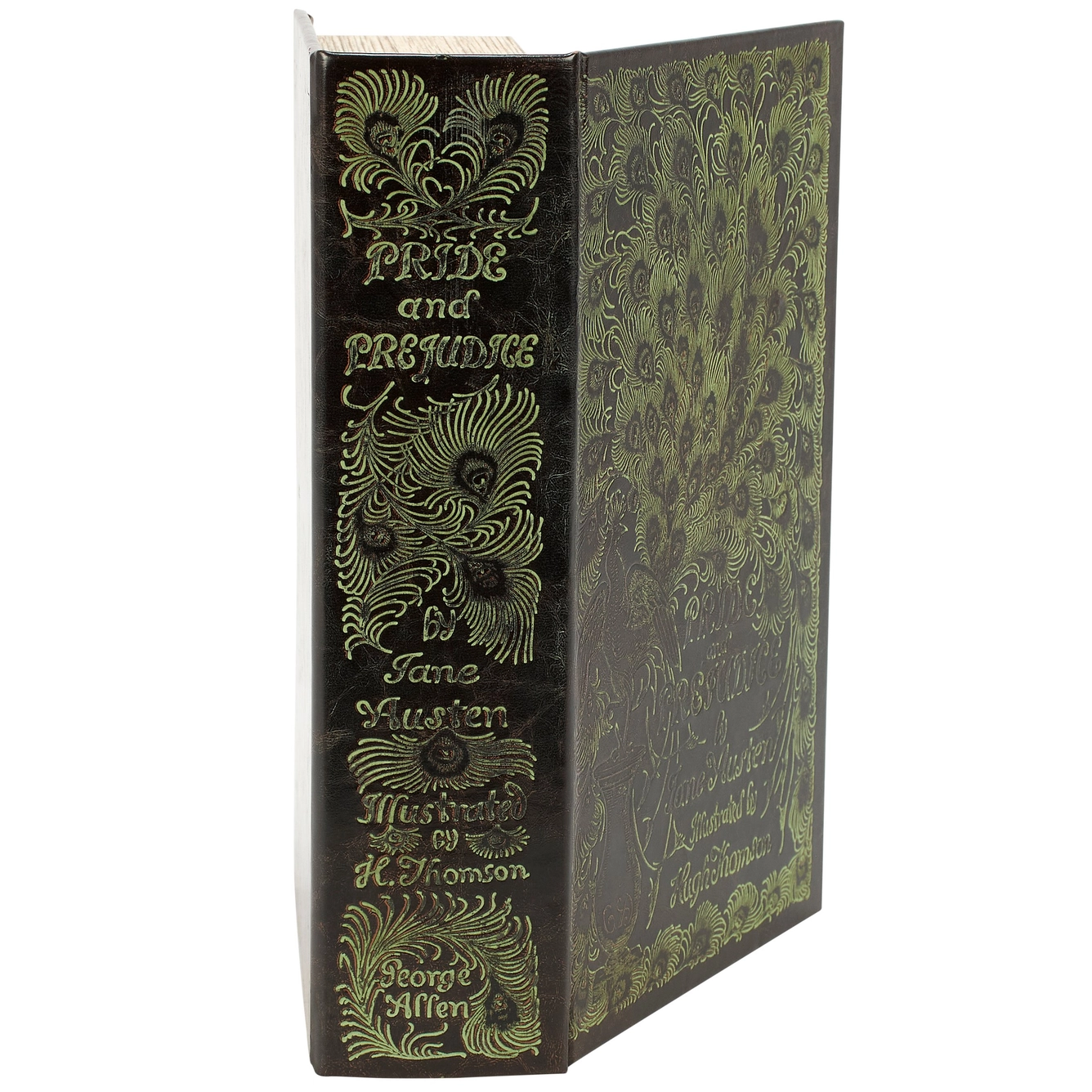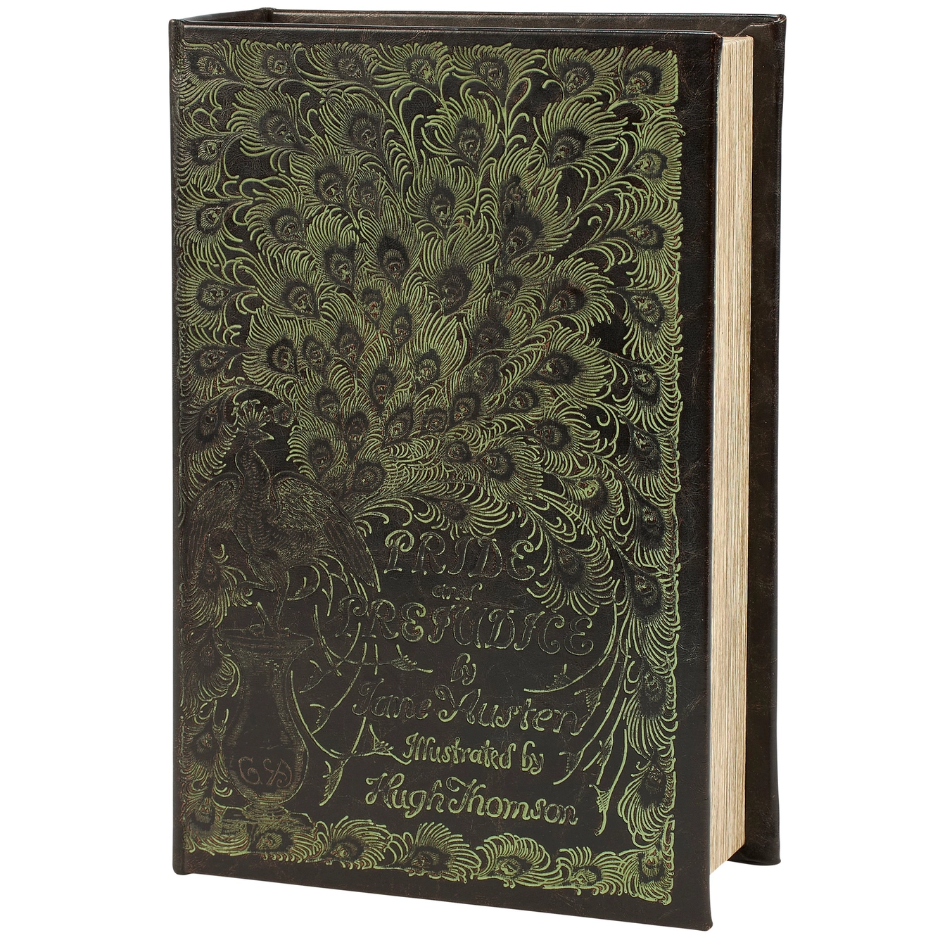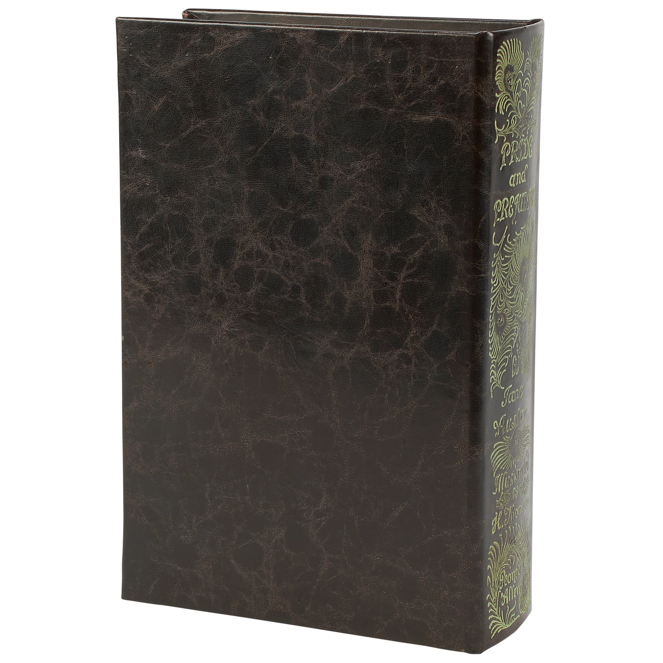 This book box features a faux leather wrap displaying the exterior of a vintage "Pride And Prejudice" book with distressed accents and embossed details inspired by an artistic feather design. It also displays a coordinating design on its side with embossed details for the "Pride And Prejudice" title, author, and illustrator giving the appearance of a book spine when on a shelf. The front cover opens to reveal a velvet lined space for storing items with a magnet closure for secure storage when standing up. It can be used upright on a bookshelf or laid flat with the cover open displaying decorative accents inside.