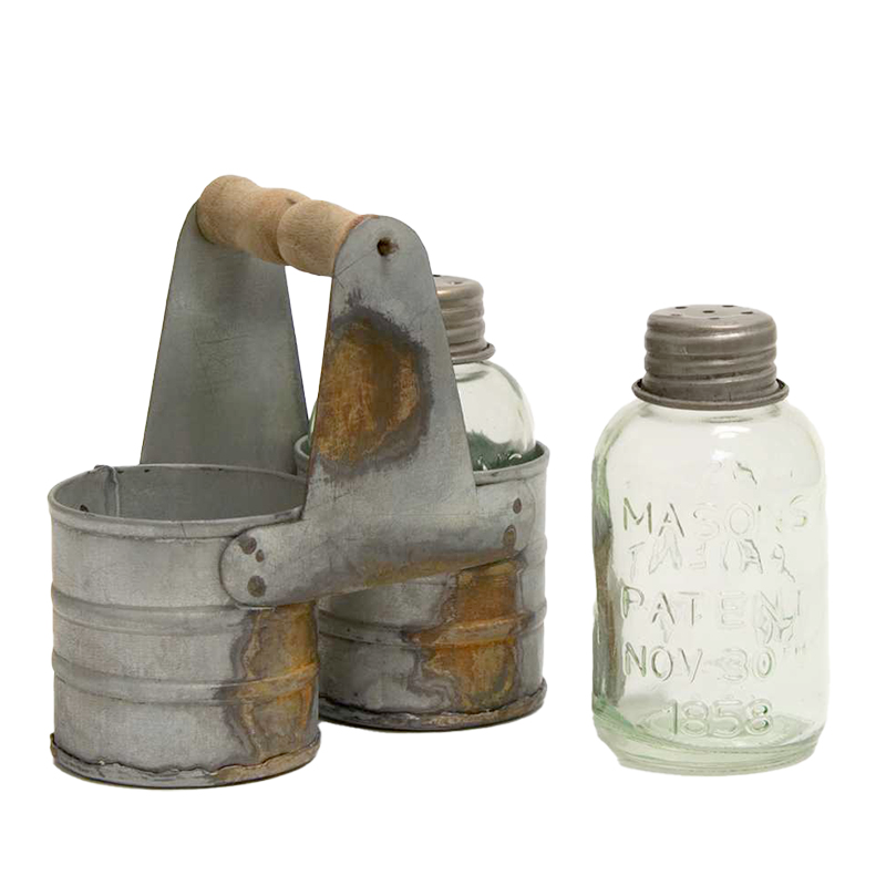 This classic three-piece salt and pepper shaker set includes a metal caddy with the look of rust spots holding two glass mason jars with metal shaker lids. It's essential for a rustic farmhouse kitchen collection.