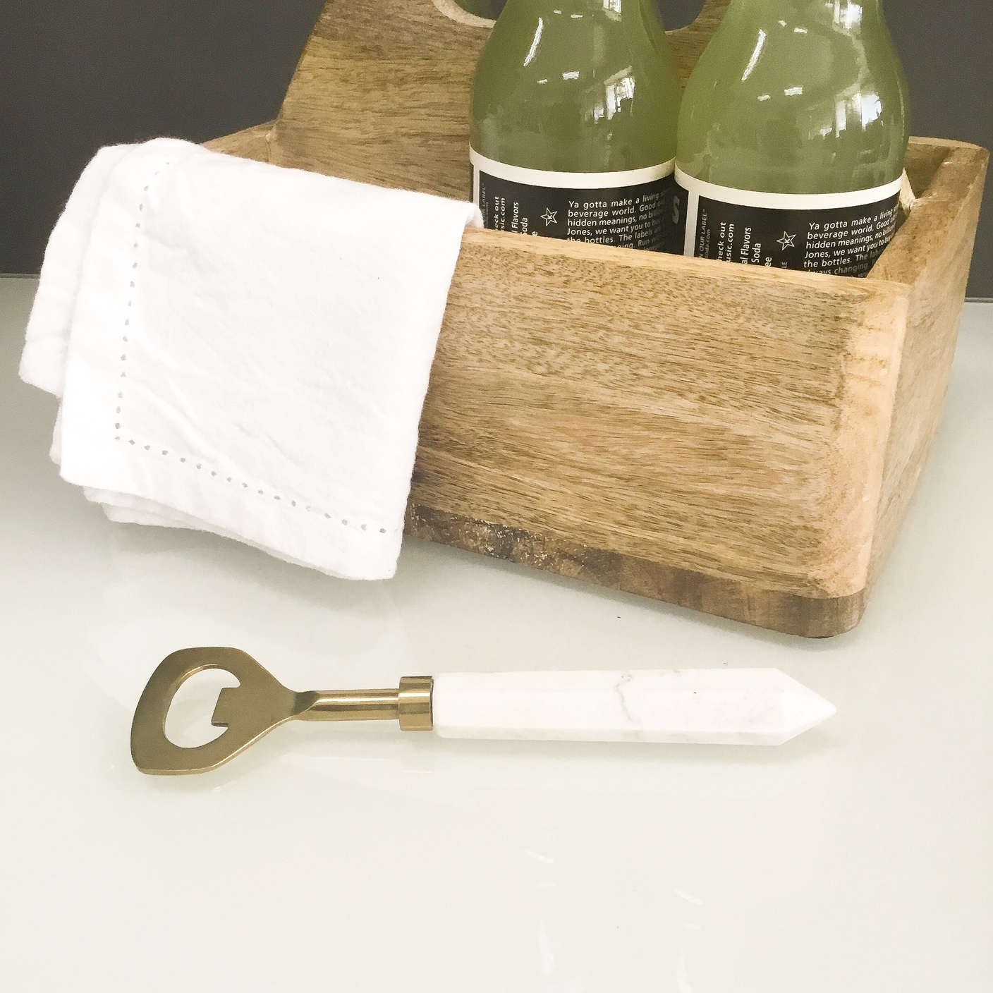 Handmade using sustainable materials, this gorgeous bottle opener is perfect for your traditional home. It features a gold metal finish with a white marble handle. Pair this with other gold serving pieces for a classic look.