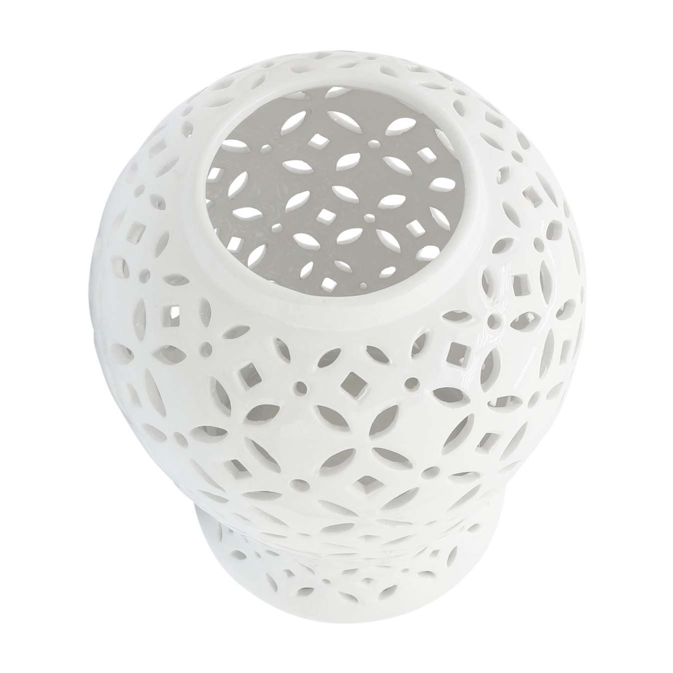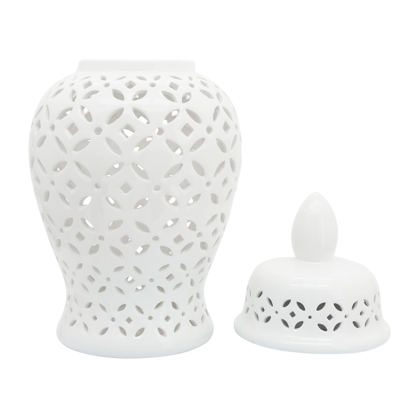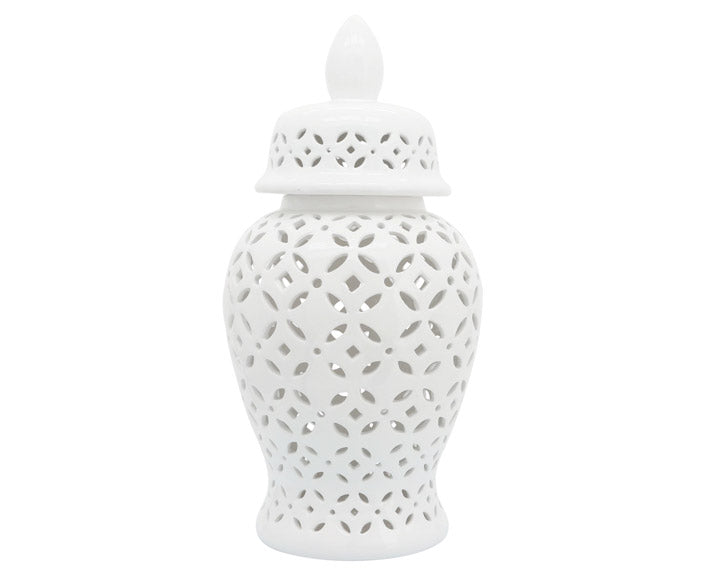Elevate your decor with this stunning white ceramic jar featuring intricate cutout patterns. Its timeless design adds sophistication to any home or living room, making it a perfect accent piece for classic interiors. Its sturdy stoneware build is resistant to chipping and fading, offering a lasting statement piece for your bedroom, office, or entryway. Ideal for tabletops or console tables, this elegant white jar blends seamlessly with various decor styles. Whether placed alone or paired with other pieces, it enhances your space with a refined and luxurious aesthetic.