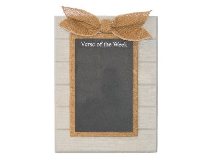 Add a charming touch with this "Verse of the Week" chalkboard featuring a distressed wood frame, burlap details, and a cute bow. It can be hung on a wall, but it is also perfect for a table or kitchen counter.