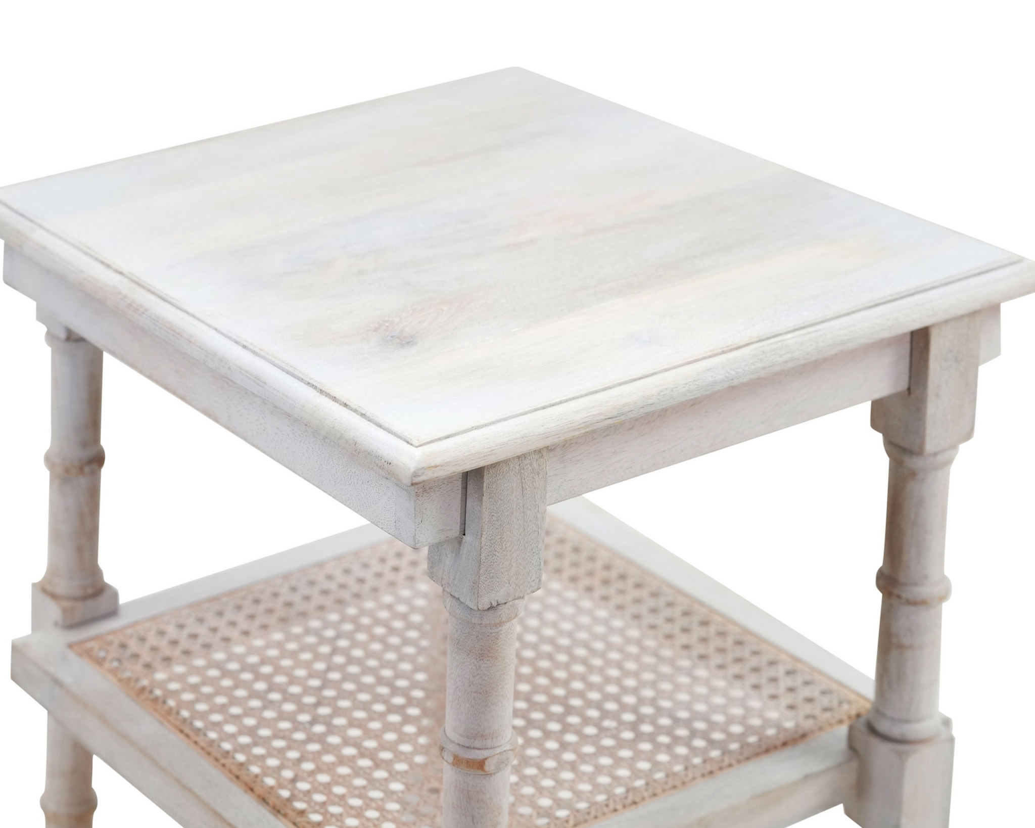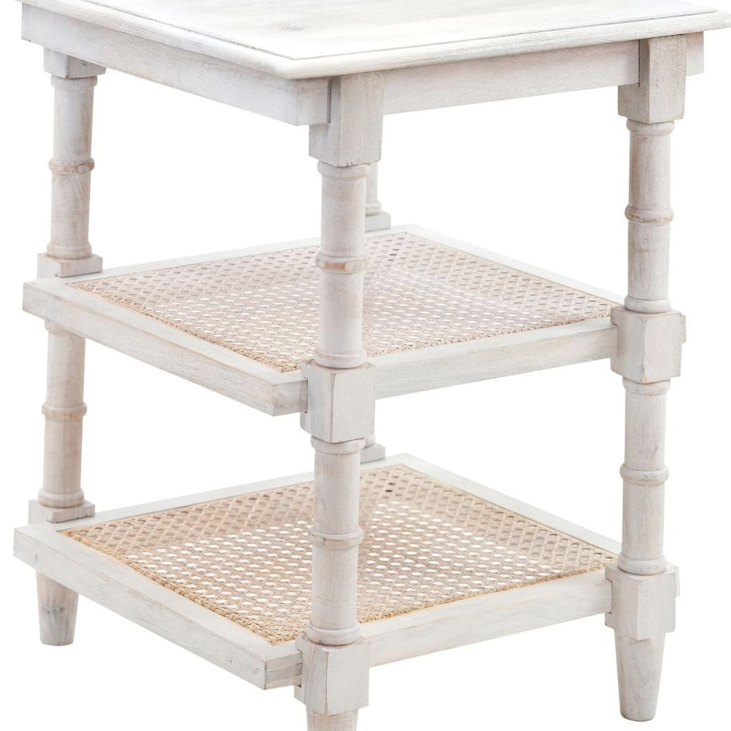 Show off your exquisite taste with this antiqued white solid wood end table with two shelves. This table features quality construction from solid wood and an updated monotone color scheme with antiqued white as the main color on both the top and the base. It includes two shelves for additional storage or display space. This piece provides an ideal location for placing your snacks and drinks during a family movie night, and a place to keep your lamp, frames, or other accessories. You can also use it as an entryway table to hold your keys.