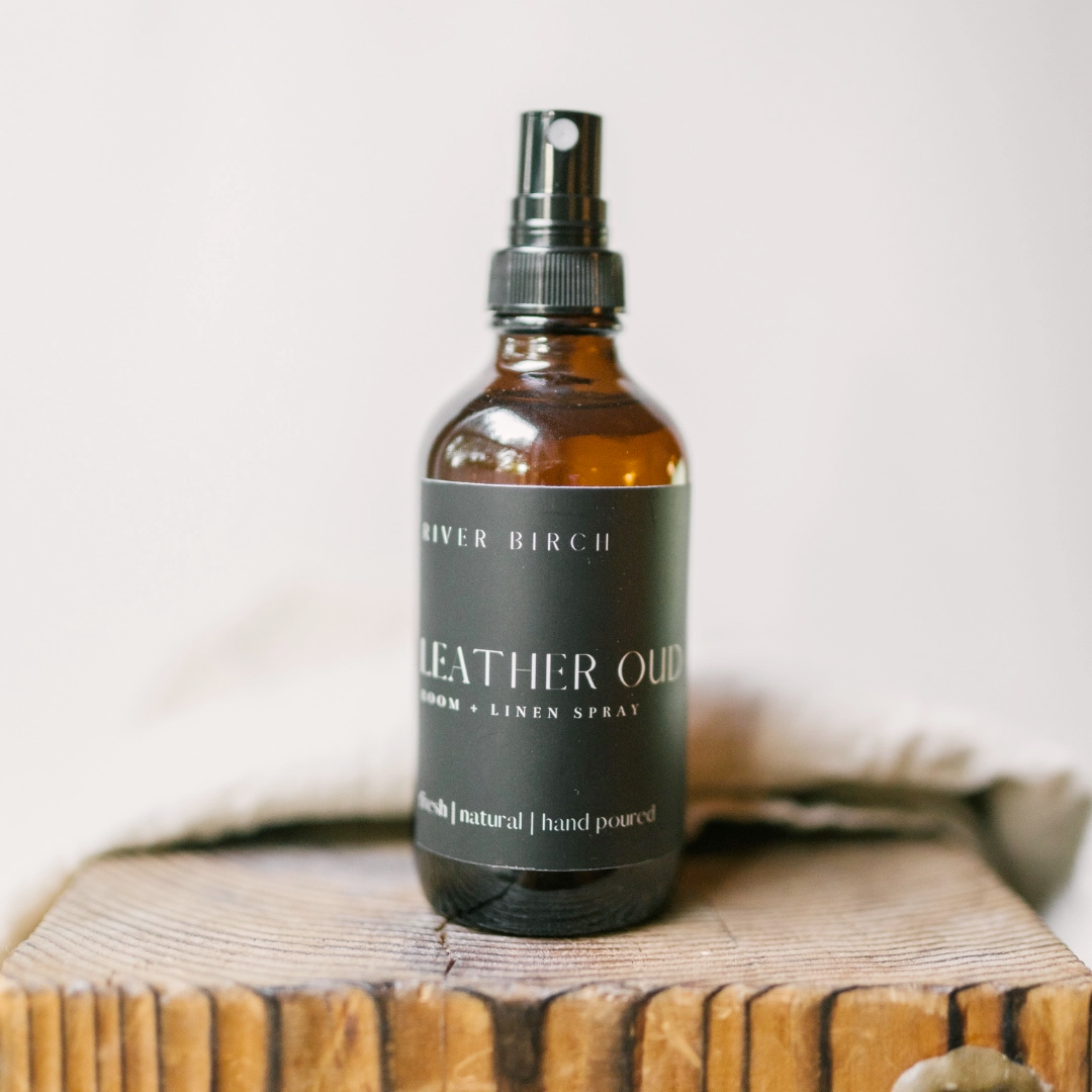 This room spray features a masculine combination of leather, black currant, oud wood, and oak moss. Truly unforgettable and addictive, this ultra fine, organic mist disperses fragrance into the air, thoroughly filling space. It is also safe to use on linens. It is packaged in an amber glass bottle with a black label and a black spray nozzle.