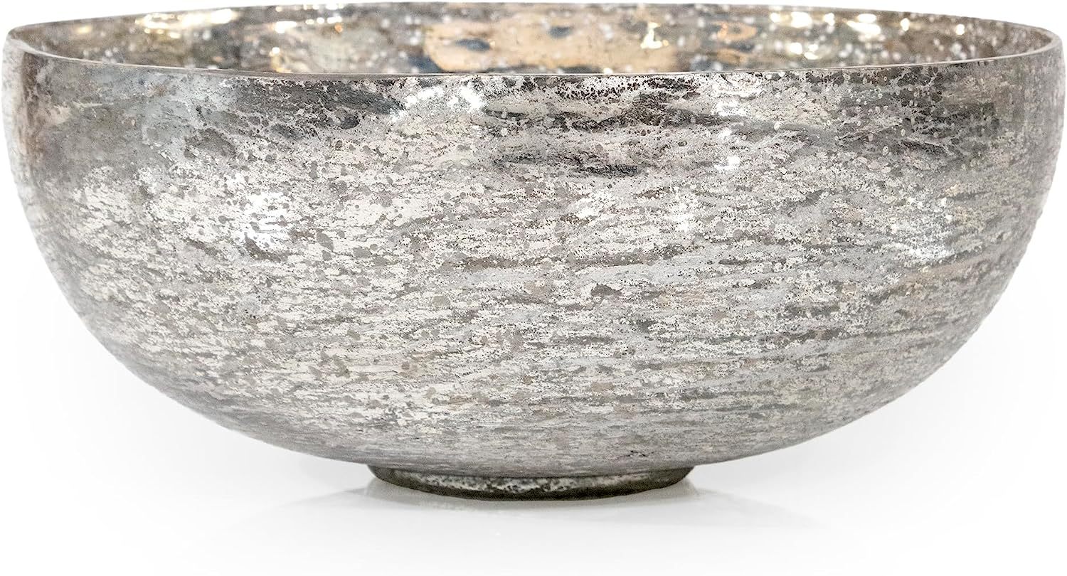 This elegant round mercury glass bowl is perfect for a large coffee table. It features a polished silver finish. Display potpourri or seasonal florals for a timeless look that won't go out of style.