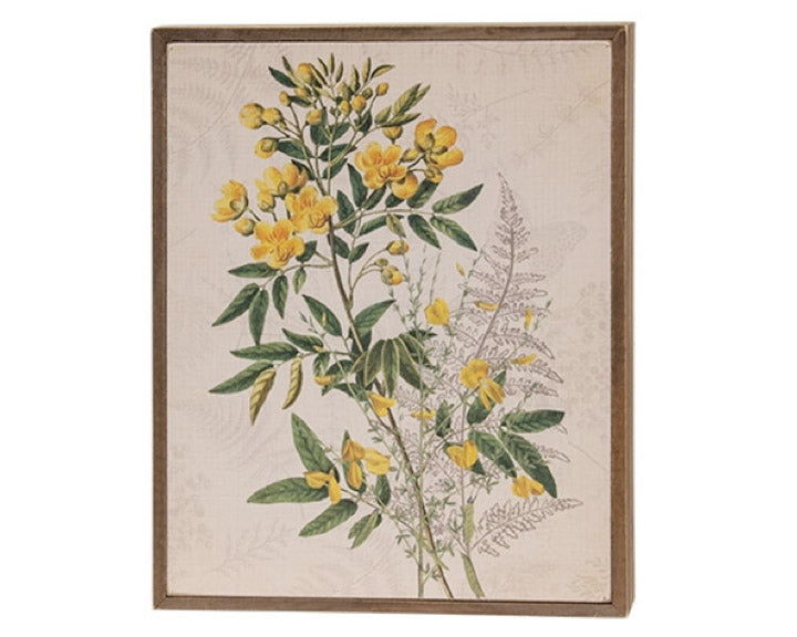 This adorable print brings a colorful nature-inspired accent to springtime or everyday decor. The sign depicts bright, realistic yellow and green botanicals in a vintage scientific-inspired style on a cream-colored background. Shadowy depictions of plants adorn the background for a dimensional look. Neutral wood edges frame the sign, and an open back allows for freestanding or hanging display.
